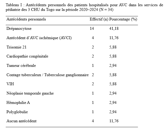 Introduction Les accidents vasculaires cérébraux (AVC) représentent un véritable enjeu de santé publique dans le monde (14). En 2019, l’incidence mondiale des AVC était estimée à 12,2 millions, la prévalence à 101 millions et la mortalité à 6,55 millions (7). En Afrique subsaharienne, l’âge moyen de survenue des AVC chez l’adulte est de 53 ans (5). Toutefois, il existe encore peu d’études consacrées aux AVC pédiatriques dans cette région (1,6,9,12,13). Malgré cette rareté, les AVC de l’enfant ne sont pas moins graves, car ils sont responsables de nombreuses séquelles. En effet, la lésion cérébrale survient sur un cerveau en développement, et les conséquences motrices, intellectuelles, comportementales, psychologiques ou adaptatives peuvent n’apparaître que plusieurs années après l’accident (2). Il apparaît donc essentiel de mieux connaître les spécificités de cette pathologie chez l’enfant, afin d’améliorer la prise en charge, notamment à la phase aiguë, mais aussi de renforcer les stratégies de prévention. Méthodologie Les services de pédiatrie du Centre Hospitalier Universitaire (CHU) Campus, du CHU Sylvanus Olympio (SO) et du CHU Kara au Togo ont constitué le cadre de l’étude. Les CHU Campus et SO sont situés à Lomé, capitale du pays au sud, tandis que le CHU Kara se trouve dans la ville de Kara au nord. Il s’est agi d’une série de cas rétrospective, couvrant la période du 1er janvier 2020 au 31 décembre 2024 (5 ans). L’étude a porté sur 34 patients hospitalisés pour AVC dans les services de pédiatrie des trois CHU. 🔸 Critères d’inclusion et d’exclusion