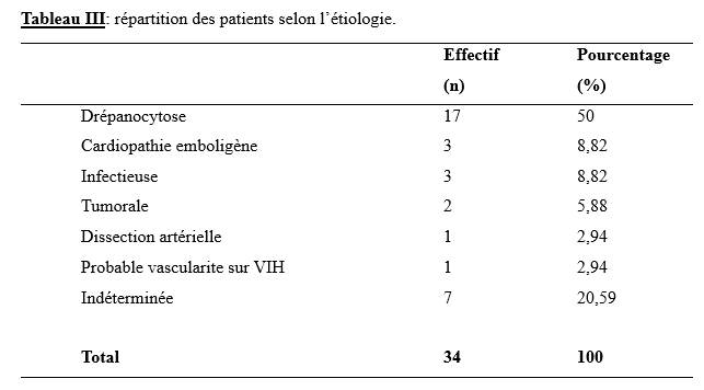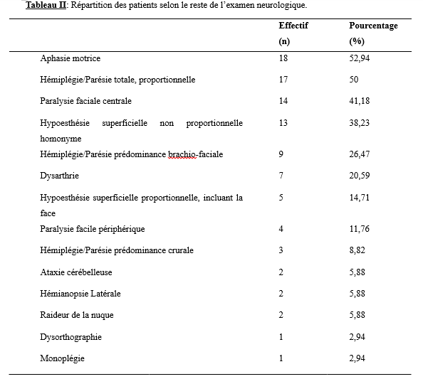 Résultats Durant la période d’étude, 34 patients ont été hospitalisés pour AVC et sont donc rentrés dans notre étude. Nos résultats ont porté sur ces 34 patients hospitalisés. La moyenne d’âge des patients était de 7,68 ± 1,49 ans avec des extrêmes de 23 mois et de 15 ans. Vingt (58,82 %) patients étaient de sexe masculin et 14 de sexe féminin (41,18%) avec un sex-ratio Homme/Femme (H/F) de 1,43. Les antécédents personnel des patients ont été rapportés dans le tableau 1. Dix (29,41%) patients avaient des antécédents familiaux notamment 6 cas de présence de traits drépanocytaire, 2 cas de consanguinité et 1 cas d’hypertension artérielle. Selon le motif de consultation, nous avons noté 14 cas de déficit moteur hémicorporel, 11 cas de troubles de la marche, 5 cas de crises convulsives ainsi que 4 cas d’asymétrie faciale. La majorité des symptômes sont survenue brutalement chez 23 patients (67,65%) et rapidement progressif chez 11 patients (32,35%). Les données de l’examen clinique, ont été rapportées dans le tableau II. La tomodensitométrie cérébrale a permis de rapporter un AVC ischémique (AVCI) chez 28(82,35 %) patients et un AVC hémorragique (AVCH) chez 6 (17,65 %) patients. Les territoires de l’artère cérébrale moyenne (ACM) étaient les plus touchés chez 25(73,53%) patients. L’électrocardiogramme a été réalisé chez 10 (29,40%) patients et avait mis en évidence chez un patient un bloc de branche incomplet droit tandis que l’échographie cardiaque réalisée chez 9 (26,47%) patients, révélait une tétralogie de Fallot chez 1 (2,94%) patient et chez 1 (2,94%) une persistance du canal artériel avec un remodelage concentrique du ventricule gauche et chez 1 (2,94%) une communication interventriculaire chez un patient. L’échographie des troncs supra-aortiques (EDTSA) réalisée chez 4 (11,76 %) patients, n’a objectivé aucune anomalie. Les anomalies notables du bilan biologique ont été une drépanocytose SS chez 3(2,94%) patient, une séropositivité au VIH1 chez 1(2,94%) patient et une tuberculose neuroméningée chez 1(2,94%) patient. La durée moyenne d’hospitalisation était 9,43 jours avec des extrêmes de 3 et 25 jours. Quinze (44,11%) patients ont été pris en charge avant les 24 premières heures suivant le début des symptômes et 19 (55,88%) patients au-delà des 24 heures. La moitié des patients a bénéficié d’un traitement à base d’antiagrégant plaquettaire et 3 (8,82 %) patients ont bénéficié d’un traitement anticoagulant. Enfin, plus de la moitié des patients a bénéficié de la rééducation dont 20 (58,82 %) patients ont bénéficié d’une rééducation kinésithérapique et 9 (26,47%) patients ont eu recours aux soins orthophoniques. L’évolution a été favorable chez 24 patients (61,76 %), 10 (29,41%) patients ont présenté des complications et 3 (8,82%) patients sont décédés. Les étiologies des AVC en pédiatrie ont été rapportées dans le tableau III. Discussion Il serait réducteur de considérer notre étude comme représentative de l’ensemble des AVC pédiatriques au Togo. En effet, la rareté des services de neurologie au Togo (3 services) crée de fait un effet centripète mais limitatif de l’accès des populations aux soins neurologiques, surtout celles très éloignées desdits centres. En outre, notre étude a porté sur 34 cas d’AVC dans les CHU du Togo. Le fait que la totalité des soins soit exclusivement à la charge des patients, il n’est pas exclu que certains patients avec un diagnostic présomptif n’aient pas pu honorer la tomodensitométrie cérébrale et donc aient été exclus de notre étude. Enfin, le caractère rétrospectif avec comme difficultés d’archivage et de conservation des dossiers médicaux nuit à l’exhaustivité de notre étude. Dans notre série, la moyenne d’âge des patients était de 7,68 ± 1,49 ans avec des extrêmes de 23 mois et de 15 ans. Cette moyenne est superposable à celle de Thiam et al. au Sénégal en 2022 qui avaient rapporté un âge moyen de 7,7 ans avec des extrêmes de 7 mois et 18 ans (16), ainsi qu’à Tohodjèdé et al. au Bénin en 2018 (17) qui ont rapporté 8 ans avec des extrêmes de 12 mois et 15 ans. La drépanocytose est l’antécédent personnel le plus retrouvé avec un effectif de 14 patients (41,18 %). Ce résultat est similaire à celui de Tohodjèdé et al. au Bénin en 2018 qui avaient également noté une prédominance de la drépanocytose, tout comme rapporté par Mbaye et al. en 2021 (11) à Dakar et par Thiam et al. en 2022 à Ziguinchor au Sénégal (16). La drépanocytose comme principal antécédent pourrait s’expliquer par un contexte épidémiologique sous-régional marqué par une forte prévalence de la drépanocytose (4). Dans la littérature sous-régionale, après la drépanocytose, les cardiopathies occupent une place quasi-permanente au tableau des antécédents personnels (3,11,16,17). Notre étude ne déroge donc pas à cette règle. Par ailleurs, le déficit moteur hémicorporel et les troubles de la marche ont constitué les principales circonstances de découverte des AVC dans notre étude soit respectivement dans 41,18 % et 32,35 % des cas. Le déficit moteur est souvent évoqué isolément mais il est parfois associé à d’autres signes dont particulièrement l’hyperthermie et/ou les crises convulsives. Tout ceci est corroboré par les données de la littérature en ce qui concerne les spécificités des AVC pédiatriques surtout avant 10 ans puisqu’après 10 ans les AVC pédiatriques tendent à ressembler à ceux des adultes (10,13). En effet, ces derniers sont marqués par une grande fréquence du déficit moteur accompagné souvent d’une hyperthermie d’origine centrale et de crises convulsives qualifiées d’inaugurales (8). Tohodjèdé et al. au Bénin en 2018 et Thiam et al. au Sénégal en 2022 corroborent également ces faits (16,17