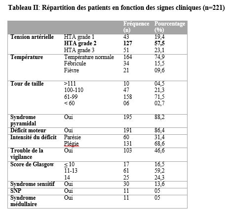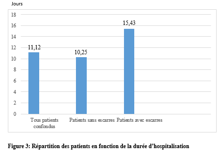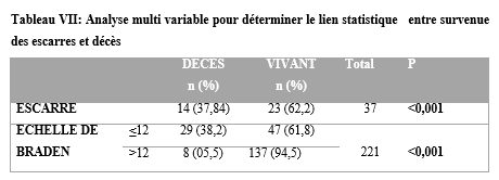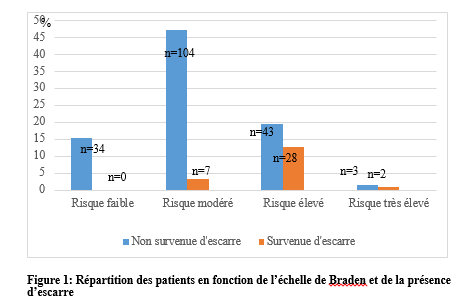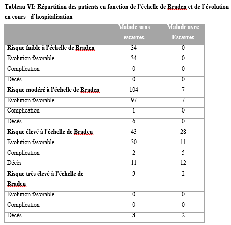 SUMMARY Introduction: Pressure ulcers are a debilitating disease that is a huge burden on those affected. Its prevention is an indicator of the quality of care in a hospital department. Objective: To evaluate the mortality and morbidity as well as the determinants of pressure ulcers in hospitalized patients. Method: This was a prospective cohort study which took place from January 2024 to June 2024 in the neurology hospitalization department of the Cocody University Hospital Center. All patients hospitalized in the neurology department and who agreed to participate in the study were included in the study. The BRADEN scale was the scale used to assess the risk of pressure ulcers occurring. Results: Of the 221 patients included, 57.9% were women, with a mean age of 53 years (9 to 85 years). The patients who had a high or very high risk on the BRADEN scale had pressure ulcers in 65.2% of cases. The incidence of pressure ulcers during hospitalization is 07.1%. The mean length of hospital stay for patients with pressure ulcers was 15.4 days compared to 10.2 days for those without pressure ulcers. Patients with a pressure ulcer died in 37.8% of cases and those without a pressure ulcer died in 11.9% of cases. Conclusion: Pressure ulcers, a major and frequent complication of decubitus, are responsible for prolonged hospital stays, a high risk of death and the occurrence of other complications. Keywords: Pressure ulcer; Death; Morbidity. INTRODUCTION Selon le National Pressure Ulcer Advisory Panel (NPUAP) définir une lésion cutanée d’origine ischémique liée à une compression des tissus mous entre un plan dur et les saillies osseuses (2, 10). La prévalence des escarres est en augmentation dans plusieurs régions du monde (15). En France, sa prévalence était estimée à 8,4% en 2014 (4). Et en Afrique, une Méta-analyse réalisée en 2020 montrait que la prévalence ponctuelle des escarres était de 11% en Afrique (3). De plus, malgré l’augmentation des connaissances médicales et de nouvelles préventions et traitements efficaces, l’escarre reste une pathologie courante et débilitante qui représente un énorme fardeau pour les personnes touchées, les soins de santé, les systèmes et coûts socio-économiques (11, 15). La plupart des études menées sur les escarres dans le monde, sont axées sur la prévalence et l’incidence des escarres (4, 7, 15). D’autres études se sont intéressées aux facteurs de risque et à la prévention des escarres et à sa prise en charge (1, 6). Peu de données sont retrouvées dans la littérature sur la mortalité hospitalière liée aux escarres. En neurologie du fait du handicap des patients, ceux-ci pourraient être exposés à l’alitement prolongé et éventuellement au risque de survenu d’escarre. Mesurer son ampleur dans un service tel que la neurologie et en évaluer son impact fourniraient des indicateurs pertinents de décision en santé publique. Les escarres pourraient être significativement liées à la mortalité et prolongeraient la durée d’hospitalisation des patients hospitalisés au service de neurologie. Nous avons ainsi réalisé cette étude afin d’évaluer la mortalité et la morbidité ainsi que les déterminants des escarres en hospitalisation de neurologie. MATERIEL ET METHODE Il s’est agi d’une étude cohorte, prospective portant sur tous les patients hospitalisés du 1er janvier 2024 au 30 juin 2024 au service de neurologie du CHU de Cocody à ABIDJAN. Sa capacité d’accueil est de 37 lits. Il est subdivisé en 2 sous-unités soit une de neurologie générale et une neurologie vasculaire. Ont été inclus dans l’étude tous les patients hospitalisés durant la période d’étude. Les différentes variables étudiées étaient les données sociodémographiques (l’âge, le sexe, la profession, le niveau scolaire, le statut matrimonial), les données cliniques (le motif d’hospitalisation, les antécédents, la température, le tour de taille, le score prédictif de survenue d’escarres BRADEN (cette échelle comprend six items tels que la perception sensorielle, l’humidité, l’activité, la mobilité, la nutrition, la friction et le cisaillement. Chaque item est noté de 1 à 4 sauf l’item friction et cisaillement qui est noté de 1 à 3. Le score total de cette échelle est de 23. Plus le score bas, plus le risque de survenu d’escarre est élevé), les syndromes neurologiques à l’admission, le diagnostic retenu, le type de complication de décubitus, le siège de l’escarre, le stade de l’escarre, la dimension, le délai d’apparition de l’escarre), les données biologiques (la glycémie veineuse, le taux d’hémoglobine, la CRP, l’hémoculture, la procalcitonine), les données thérapeutiques et évolutifs (le type de matelas, la présence de coussin, l’intervalle d’immobilisation, la fréquence de nettoyage de l’escarre, les moyens de prise en charge des escarres, l’évolution en cours d’hospitalisation, la durée d’hospitalisation). Les variables quantitatives ont été exprimées par leur moyenne ± écart type ou par leur médiane ± étendue. Les variables qualitatives quant à elles ont été exprimées par leur effectif et proportion. L’analyse statistique a été faite à l’aide des tests de Chi2 et de Ficher avec un seuil de significativité p ˂ 0,05. RESULTATS Sur les 221 patients inclus, 57,9% étaient des femmes, avec une moyenne d’âge de 53 ans et un sex ratio de 0,7 (tableau I). Le déficit moteur et le trouble de la vigilance étaient les motifs d’hospitalisation les plus retrouvés. Les patients avaient un déficit moteur sévère (plégie) dans 68,6% des cas et un trouble de la vigilance avec un score de Glasgow inférieur ou égal à 10 dans 16,5% des cas (tableau II). Les patients qui avaient un risque élevé ou très élevé à l’échelle de BRADEN ont eu des escarres dans 65,2% des cas (figure 1). L’escarre était présente ch