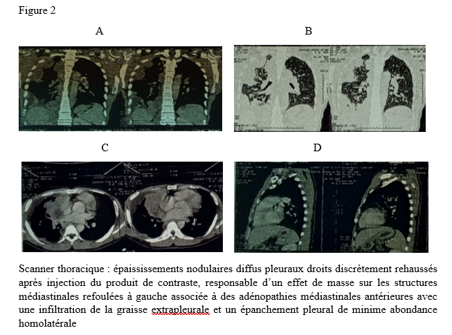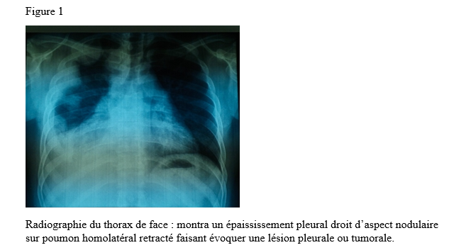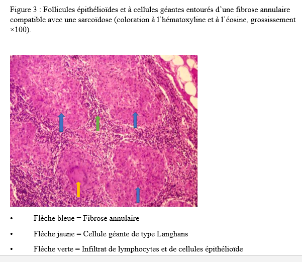 INTRODUCTION La myasthénie grave est une maladie auto-immune de la jonction neuromusculaire (8). Il s’agit d’une affection rare, dont la prévalence est estimée entre 45 et 142 cas pour 1 000 000 d’habitants. Elle peut survenir à tout âge, avec une nette prédominance féminine (6). Dans de rares cas, la myasthénie grave peut être associée à d’autres maladies auto-immunes telles que la thyroïdite de Hashimoto, le lupus érythémateux, la polyarthrite rhumatoïde ou le diabète juvénile (3). L’association entre la myasthénie grave et la sarcoïdose est encore plus exceptionnelle (4). Nous rapportons ici un cas illustrant cette association. OBSERVATION Monsieur XY, 29 ans, douanier de profession, a été reçu en consultation neurologique pour une vision dédoublée des objets surtout lors des contrôles de bagage sur l’écran du scanner, une modification du timbre de la voix ainsi qu’une faiblesse musculaire généralisée s’aggravant à l’effort. Cette consultation, effectuée le 29 décembre 2022, a permis de relever des épisodes rares de fausses routes ainsi qu’un ptosis en cas de fatigue extrême. L’examen clinique était normal. Le diagnostic de myasthénie grave a alors été envisagé. Un test à la prostigmine a été réalisé lors d’un épisode de fatigue associé à un ptosis, avec une régression marquée des signes. La recherche de l’anticorps anti-récepteur de l’acétylcholine (Ac anti-RACH) s’est révélée positive avec un titre de 0,8 nmol/ml (valeur normale < 0,2 nmol/ml). L’électromyogramme a montré une diminution modérée du potentiel moteur à la stimulation répétitive, de l’ordre de 9 %. Le scanner thoracique était revenu normal. Le patient a été mis sous pyridostigmine 60 mg comprimé à raison de un comprimé par 8 heures. L’évolution a été marquée par une régression des symptômes avec quelques épisodes de poussées. Trois ans plus tard, en Août 2025, le patient est revenu en consultation pour une dyspnée précédée depuis trois mois de toux sèche, résistante au traitement symptomatique ainsi qu’une fatigue survenant sans le moindre effort avec des épisodes de fièvre et de sueurs nocturnes. Une consultation pneumologique fut alors faite et permis de classer la dyspnée en stade 1 selon Sadoul. ![]() La radiographie pulmonaire de face (figure 1) montra un épaississement pleural droit d’aspect nodulaire sur poumon homolatéral retracté faisant évoquer une lésion pleurale ou tumorale. ![]() Le scanner thoracique demandé (figure 2) révéla des épaississements nodulaires diffus pleuraux droits discrètement rehaussés après injection du produit de contraste, responsable d’un effet de masse sur les structures médiastinales refoulées à gauche associée à des adénopathies médiastinales antérieures avec une infiltration de la graisse extrapleurale et un épanchement pleural de minime abondance homolatérale. Devant cet aspect scanographique, une fibroscopie bronchique fut réalisée montrant une muqueuse bronchique légèrement inflammatoire dans son ensemble avec épaississement des éperons de division entre la lobaire supérieur et moyen à droite et entre le culmen et la lingula à gauche siège de biopsie pour l’examen anatomo-pathologique sur les pièces ainsi que le genexpert du liquide broncho-alvéolaire. La recherche de tuberculose revint négative. ![]() L’examen anatomo-pathologique des pièces biopsiques a permis de mettre en évidence la présence de granulomes épithélioïdes et giganto-cellulaires sans nécrose caséeuse (figure 3). L’examen de la peau et des phaners ainsi qu’une consultation ophtalmologique étaient normaux. La consultation rhumatologique était sans particularité. L’IRM cérébrale était normale. La spirométrie a révélé une CVF (FVCI) à 52 %, un VEMS (FEV1) à 63 %, VEMS/CVF> LIN avec absence de gain après bêta-2 mimétiques. Les données gazométriques étaient les suivantes : PaO₂ = 59 %, PaCO₂ = 54 %, pH = 7,39, Hb = 14,3 g/dl, HCO₃⁻ = 32 mmol/l. La calcémie était à 117mg/l ( 90-110 mg/l) l’IDR à la tuberculine est négative et le dosage de parathormone était revenu normal. Le diagnostic de sarcoïdose a été retenu chez notre patient. Un traitement par pyridostigmine 60 mg toutes les 8 heures et prednisolone à dose dégressive avec une dose d’entretien de 20 mg per os le matin au cours du repas a été instauré ainsi qu’un régime alimentaire pauvre en calcium et une exposition limitée au soleil. Ce traitement a permis une stabilisation de l’état clinique du patient sous surveillance multidisciplinaire. DISCUSSION Il est bien connu que des troubles de la réponse immunitaire peuvent coexister chez certains patients (12). Lorsque deux ou plusieurs maladies d’origine indéterminée sont retrouvées, plusieurs questions intéressantes se posent. Il est important de confirmer d’abord les diagnostics individuellement. Il est difficile d’aborder les mécanismes immunologiques qui déclenchent l’apparition de ces diagnostics ensemble. Bien que la coexistence de la MG et de la sarcoïdose puisse être une coïncidence, il convient de signaler ce cas en raison des multiples caractéristiques intéressantes observées ainsi que de la rareté de leur apparition. En effet, la survenue d’épisodes de fatigue chez un sujet myasthénique est souvent mise sur le compte d’une poussée myasthénique ce qui peut être source d’errance diagnostique. De même la survenue d’une hypercalcémie chez un sujet myasthénique peut orienter vers un trouble du métabolisme phospho-calcique en rapport avec une pathologie de la glande parathyroïde (13). Par ailleurs, la neurosarcoïdose est une complication chez 5 % des patients atteints de sarcoïdose (11). Les manifestations neurologiques les plus courantes de la sarcoïdose sont les neuropathies crâniennes dues à une méningite basale chronique. Le nerf facial